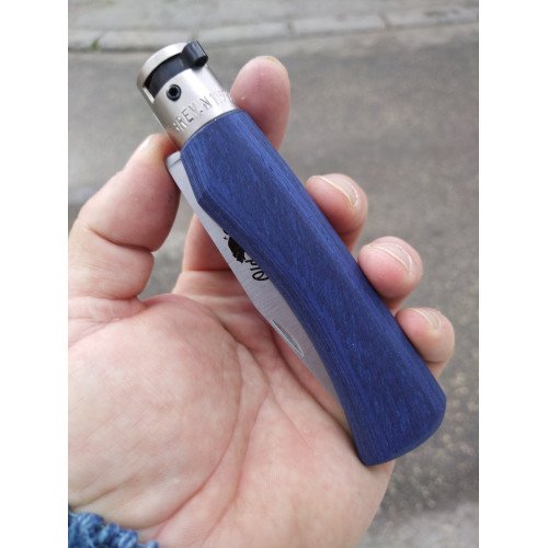 Нож "Old Bear", Син, XL, пълноцветна линия с цветна ламинирана дървена дръжка, острие от "неръждаема" стомана и никелирана месингова яка