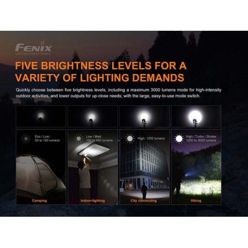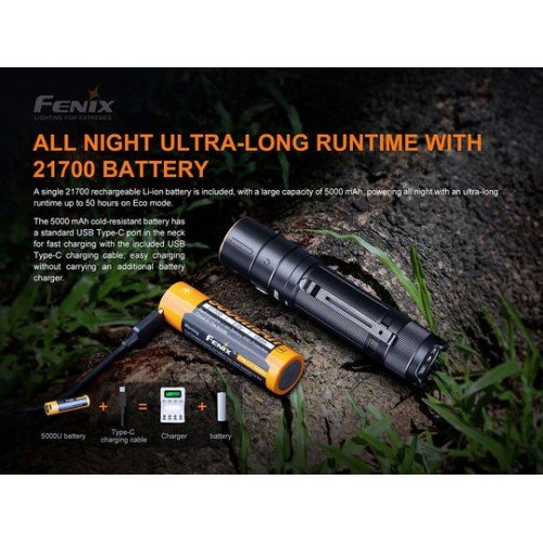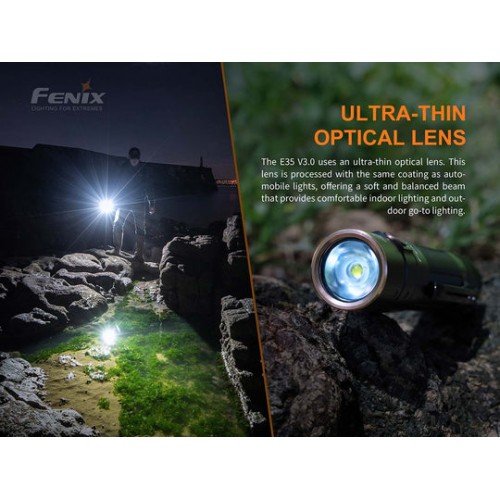 Фенерчето Fenix E35 V3.0 е надстроено с високопроизводителни функции. Това EDC вече може да произведе максимум 3000 лумена на разстояние от 787 ft (240m). Захранвана от включена 21700 (5000mAh) акумулаторна Li-ion батерия, която не само позволява тази светлина да бъде изключително ярка, но и има удължена употреба. Проектиран с ултратънка оптична леща, фенерчето E35 V3.0 създава мек и балансиран лъч. Удобният страничен превключвател активира всички режими на осветление и включва индикатор за нивото на батерията. Трудно е да победиш фенерче от 3000 лумена в чаша. Водоустойчив и прахозащитен, Fenix E35 V3.0 е изграден така, че да издържа на външни влияния. Невероятно ярка в компактен размер прави това фенерче ежедневно. Този фенер НЯМА заден ПРЕВКЛЮЧВАТЕЛ.
