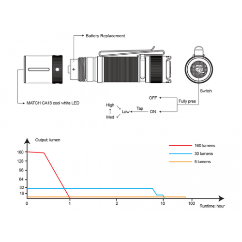 Фенерчето Fenix E12 V2.0 AA излъчва впечатляващ максимум 160 лумена от включена единична AA батерия. Използвайки ултра тънка оптична леща, това фенерче доставя мека и балансирана светлина на максимално разстояние от 223 ft (68m). Достъп до три нива на яркост с натискане на превключвателя на опашката. С дължина само 3", това фенерче е чудесен размер за всекидневно носене и със своя двупозиционен клип за тяло можете да го носите както искате – дори да го поставите на шапката си и да го използвате като челник. Това малко фенерче е изградено със здрав IP68 прахозащитен и водоустойчив корпус. Лесно захранване на фенерчето с една единствена AA батерия. Супер малък и ярък, Fenix E12 V2.0 е чудесен ъпгрейд за тези, които търсят АA захранвано EDC фенерче.