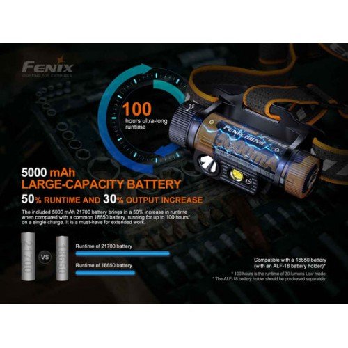 Акумулаторният фенрр Fenix HM70R разполага с батерия с голям капацитет 21700, която не само повишава този фар до максимум 1600 лумена, но и позволява 100 непрекъснат час работа при използване на 30 лумена на Low. Натиснете и задръжте големия, удобен за ръкавици превключвател, за да промените във Функционалния режим, за да получите достъп до две нива на неутрална бяла светлина, червена светлина за четене и червена светкавица. Скритият USBC порт добавя към своя IP68 прахозащитен/водоустойчив рейтинг и ви позволява бързо да зареждате фара си с ток за зареждане 2A. Индикатор за нивото на батерията, интелигентна памет и функция за заключване, закръглете функциите на акумулаторния фар Fenix HM70R.