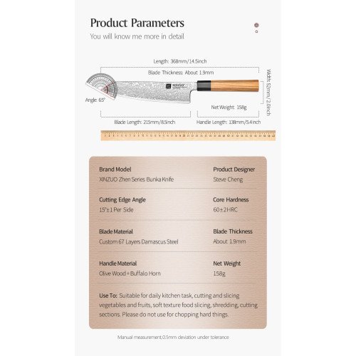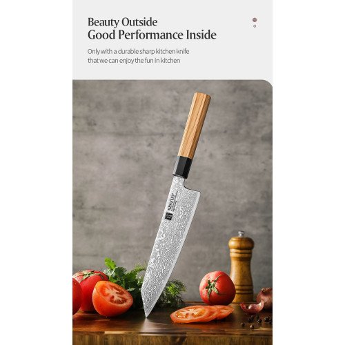 сърцевин, щателно кована на ръка и вакуумно термично обработена до висока твърдост от 62HRC, което прави значително по-здраво, по-устойчиво на корозия и ръжда от конвенционалните ножове от неръждаема стомана. Всеки нож преминава през строг 45-стъпков процес на полиране, шлайфане и хонинговане на ръбовете, за да се гарантира несравнима производителност. Включвайки традиционен японски осмоъгълен дизайн на дръжката, ножът е изработен с дръжка от маслиново дърво, което е лека, но издръжлива, предлагайки ергономичен и удобен захват за безпроблемно овладяване на различни задачи за рязане. Аналог на VG10